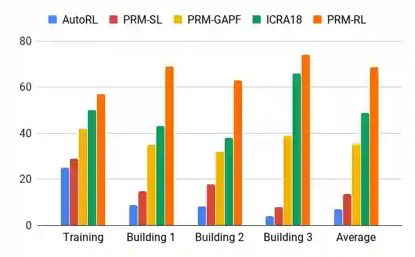在几座建筑物中导航超过100米的成功率。第一篇论文 --AutoRL仅限本地策划人(蓝色); 原始PRM(红色); 路径引导的人工势场(黄色); 第二篇论文(绿色); 第三篇论文 - 使用AutoRL(橙色)的PRM。