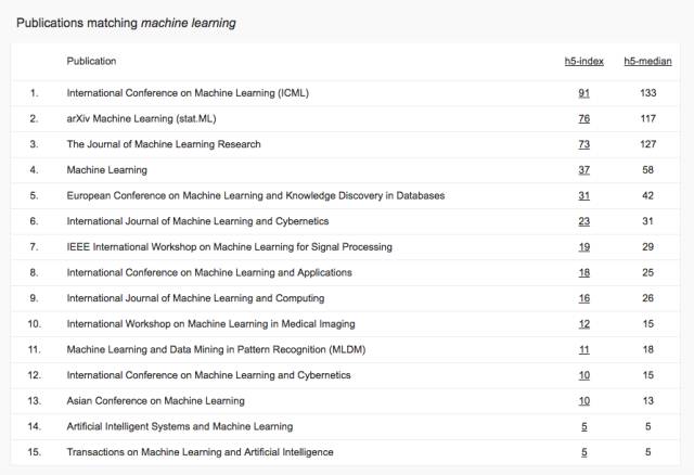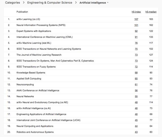 arXiv上计算机科学类以Learning为关键词的文章被排在了这个列表的第一名,H5指数107。顶会NIPS排在了第二名,Expert Systems with Applications 排在第三。
