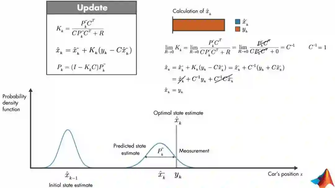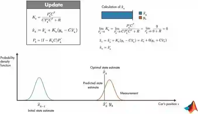 在图7中,我们用了概率密度函数去描述KF的中心思想,假设我们用数据模型得到时间点 下汽车状态 ,由于是预估值,所以会存在一定的方差,现在我们使用汽车数学模型再次预测时间 下的位置 ,由 于误差累积, 会有更大方差,同时我们也可以获取到测量值 。现在我们有了预测和测量,我们便可以通 过概率密度函数相乘的方式得到最优状态估计函数,而新的概率密度函数的平均值便是最优状态估计值(即我们 综合测量值和预测值得到的最佳定位点)。