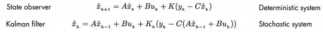 卡尔曼滤波本身便是一个最佳状态估计器,它跟前面讲的状态观察器差不多,不同的是KF是为随机系统设计的。区别如下: