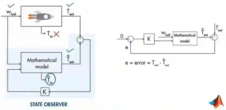 现在有一只火箭要从地球飞往火星,火箭使用液态氢作为燃料,但过高温度会导致火箭喷射器的机械部件损坏,因此监控喷射器内部温度就十分重要,可传感器不支持放置在喷射器内部,否则会被融化掉。但我们可以在喷射器外部的放置温度传感器,间接测量内部温度,但间接测量值和真实值存在误差,为此,我们可以使用状态观察器去基于间接测量值估算出真实值。