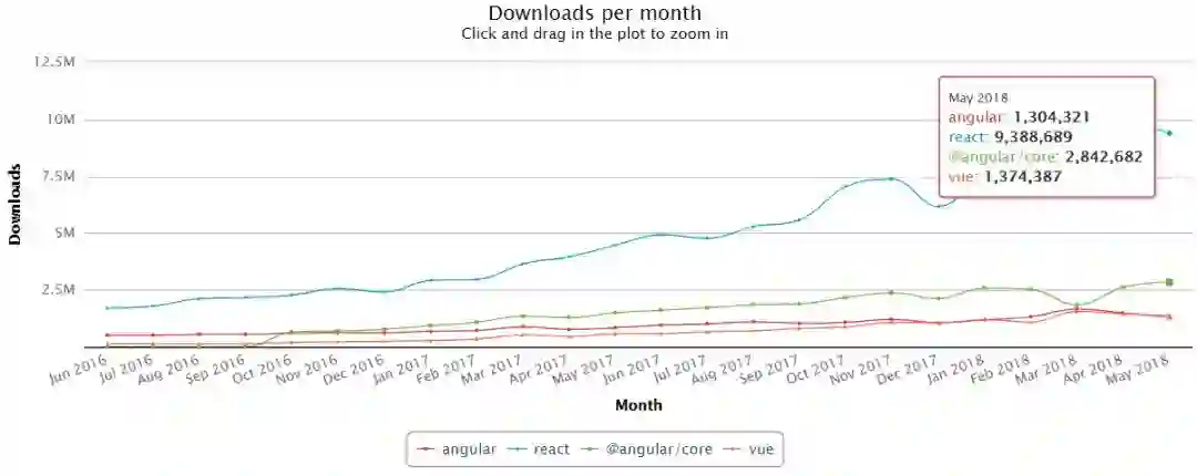 在此期间,Vue 在2016年9月的下载量约为 Angular.js 和 Angular 总和的 1/3,并于2018年5月达到 1/2,还超过了 Angular.js。