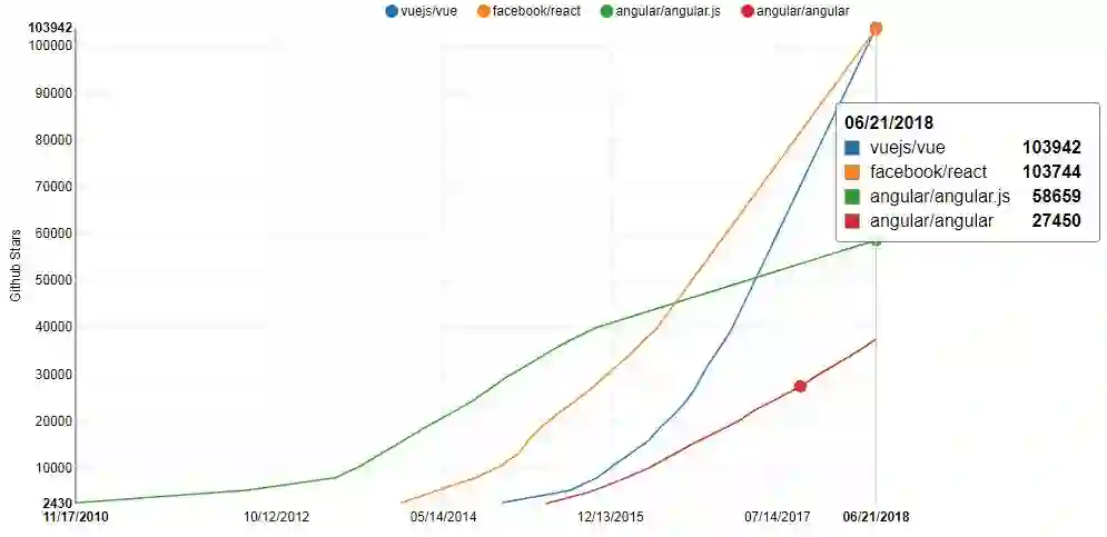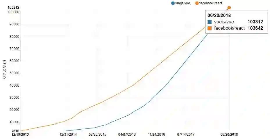 上周在前端的 JavaScript 框架世界发生了一件称得上是“里程碑”的事:Vue.js 在 GitHub 上的 star 数量终于超过了 React.js 的 star 数量。