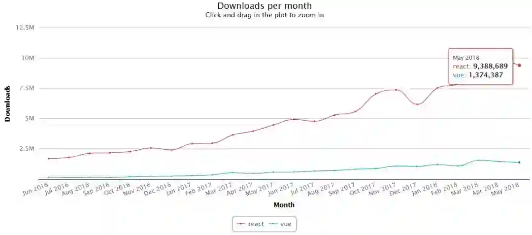 通过深入了解 NPM 的下载统计数据,我们发现尽管大家都围绕着 Vue 疯狂增长的 star 数来大肆宣传,但 React 仍然在 JavaScript 框架世界中稳坐“主导”的位置。它即将超过每月1000万的巨大下载量,并且还一直保持着高速的增长。