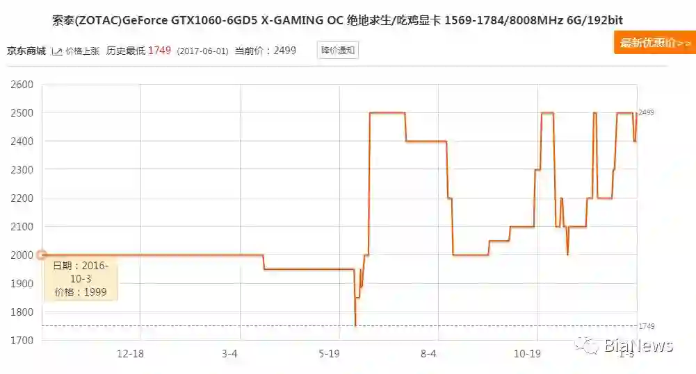 今年年初,N卡GTX1060的6G版本市场均价1800-2000元,从6月份开始出现上涨趋势,现在的价格稳定在2500元左右。