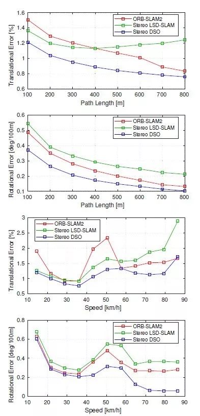 图3 针对KITTI数据集上行车间距(上两张)和行车速度(下两张)的平移和旋转误差。在所有情况中,本文没有回环检测的方法都要优于带回环检测的ORBSLAM2和LSD,令人惊讶的是在大间距下该方法也能取得更好结果,而这种情况下回环通常能明显减小误差。