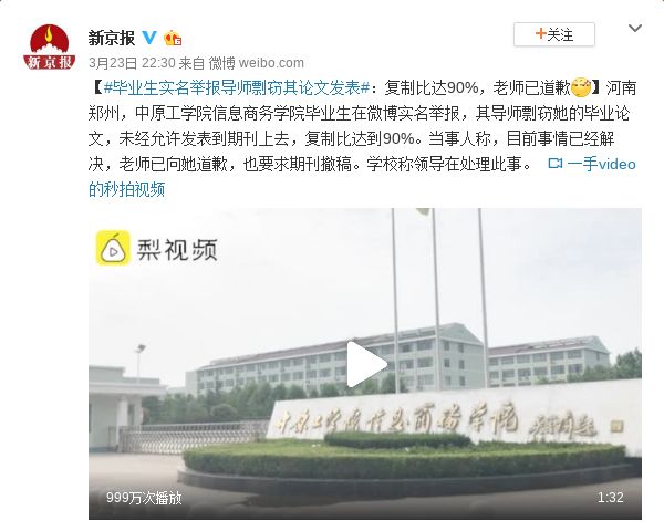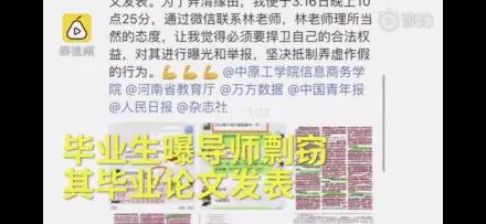 河南郑州,中原工学院信息商务学院毕业生在微博实名举报,其导师剽窃她的毕业论文,未经允许发表到期刊上去,复制比达到90%。