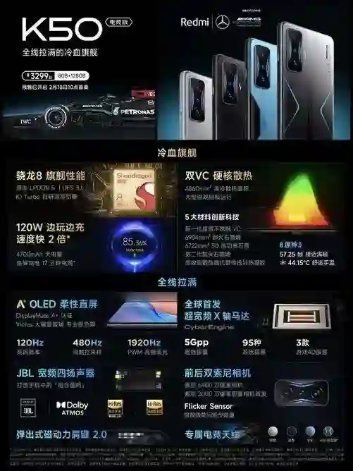 Redmi昨晚举行新品发布会,推出了包括Redmi K50电竞版、梅赛德斯-AMG马石油F1车队深度合作的K50冠军版手机以及Redmi电竞路由器AX5400。官方表示,K50电竞版可能是安卓史上最强振感,全球首发CyberEngine超宽频X轴马达,整机瞬态振动量超过iPhone 13。Redmi K50电竞版搭载目前最顶级的骁龙8处理器,拥有4860mm 双VC液冷散热,3299元起售。
