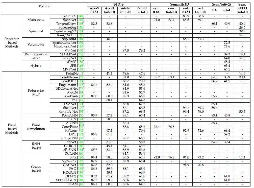 表4:S3DIS(包括Area5和6-fold cross validation)[176]、Semantic3D(包括semantic-8和reduced-8子集)[9]、ScanNet[8]和SemanticKITTI[177]数据集的语义分割结果对比。