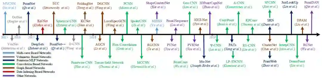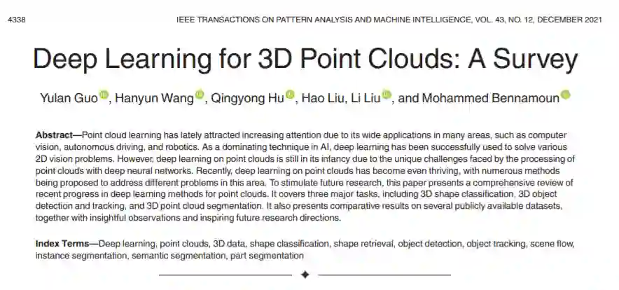【导读】3D点云学习( Point Clouds)作为近年来的研究热点之一,受到了广泛关注,每年在各大会议上都有大量的相关文章发表。当前,点云上的深度学习变得越来越流行,人们提出了许多方法来解决这一领域的不同问题。国防科技大学郭裕兰老师课题组新出的这篇论文对近几年点云深度学习方法进行了全面综述,是第一篇全面涵盖多个重要点云相关任务的深度学习方法的综述论文,包括三维形状分类、三维目标检测与跟踪、三维点云分割等,并对点云深度学习的机制和策略进行全面的归纳和解读,帮助读者更好地了解当前的研究现状和思路。也提供了现有方法在几个可公开获得的数据集上的全面比较,最后也介绍了未来的研究方向。