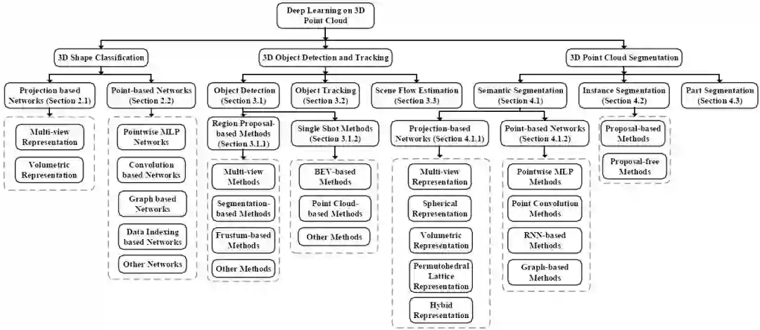 这篇论文是第一个专门针对点云的深度学习方法的综述。此外,论文全面涵盖了分类,检测,跟踪和分割等不同应用。图1显示了三维点云的现有深度学习方法的分类。