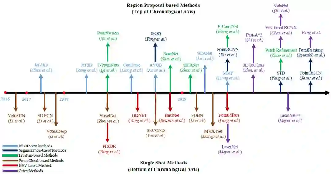 图6:按时间顺序概述的最相关的基于深度学习的三维目标检测方法。
