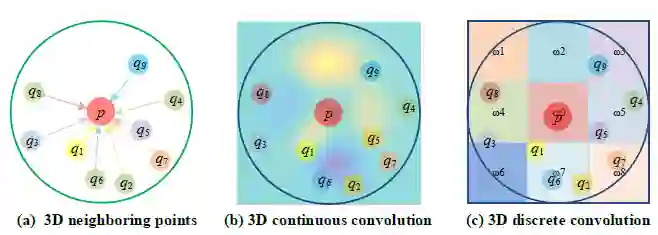 图4:点的局部邻居的连续和离散卷积的图解。(a)代表一个局部邻居;(b)和(c)分别表示三维连续卷积和离散卷积。