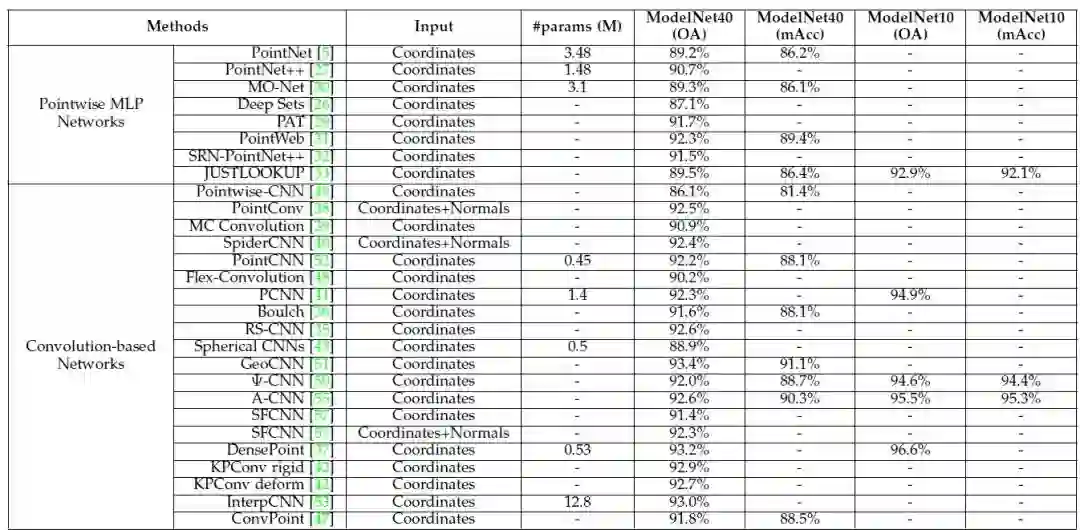 表1:在ModelNet10/40基准上比较三维形状分类结果。这里,我们只关注基于点的网络,“#params”表示相应模型的参数数量。“OA”表示总体精度,“mAcc”表示表中的平均精度。符号“-”表示结果不可用。