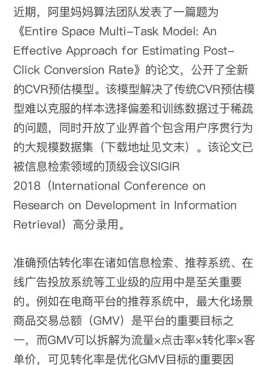 SIGIR2018高分录用——阿里妈妈公开全新CVR预估模型