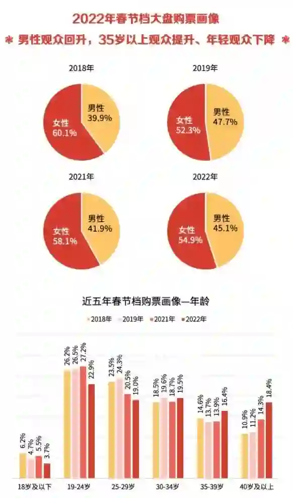 2022年春节档,40岁及以上的用户占据了18.4%,达到了近5年的最高点,而占据春节档用户比例最高的依然是19-24岁的用户,这部分用户下跌到了22.9%,而25-29岁的用户也下跌到了19%。