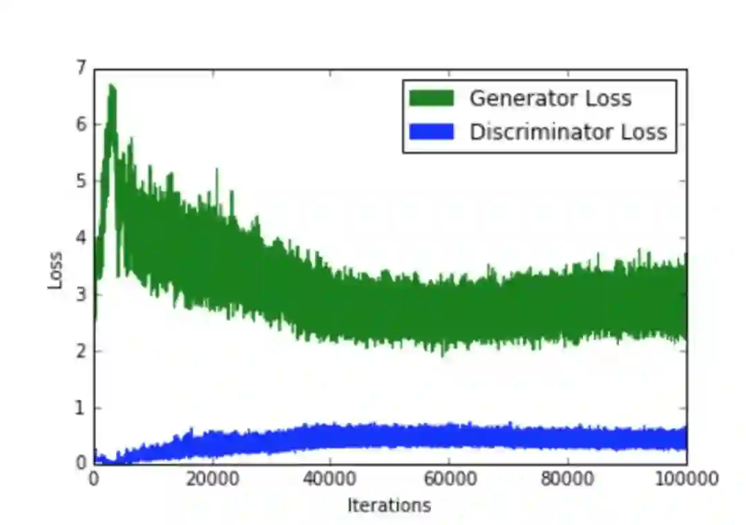 GAN 训练过程中遇到的一个问题是什么时候停止训练?因为判别网络 D 损失降级会改善生成网络 G 的损失(反之亦然),因此无法根据损失函数的值来判断收敛,如下图所示: