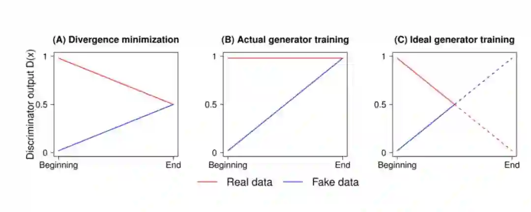 图 A 表示 JS 散度的最优解,图 B 表示使用标准 GAN 损失时判别网络 D 的输出,图 C 表示输出曲线的实际图。