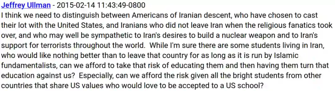 还有人找到了 Jeff Ullman 几年前关于 UMass 不再招收伊朗学生参加 STEM 研究生计划事件的评论(最终 UMass 改变了计划并照常接受伊朗学生入学):