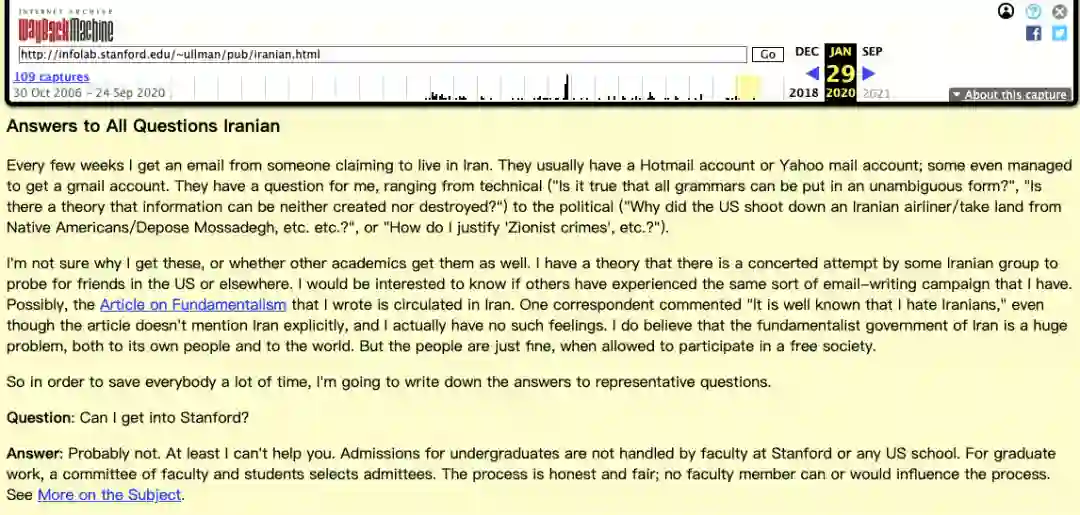 怎么回事?质疑者表示,Jeff Ullman 有着严重的种族主义倾向。他曾在个人主页中公开回复过自己关于伊朗的一些问题,同时「阻止伊朗学生前往斯坦福大学攻读研究生」。