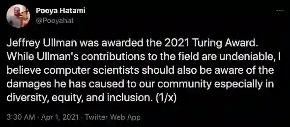 但在获奖之后,一些质疑的声音也随之出现:几天内,许多推特网友陆续扒出了他的「黑料」——并且要求 ACM 官方取消 Jeff Ullman 的获奖资格。