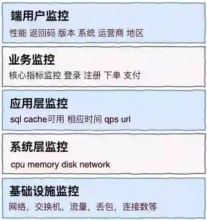 一个比较完善的微服务监控体系需要涉及到哪些层次?如下图,大致可以划分为五个层次的监控: