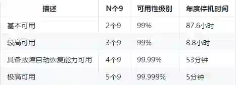 在业界有一套比较出名的评定网站可用性的指标,常用 N 个 9 来量化可用性,可以直接映射到网站正常运行时间的百分比上: