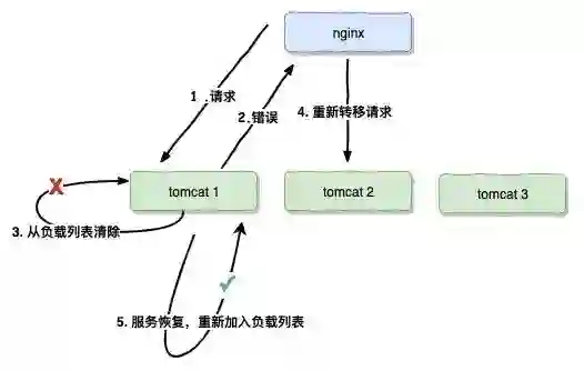 转移流程:Nginx 根据给定好的负载均衡算法进行调度,当请求到 Tomcat1,Nginx 发现 Tomcat1 出现连接错误(节点失效),Nginx 会根据一定的机制将 Tomcat1 从调用的负载列表中清除。