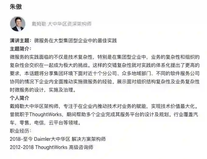想了解更多微服务在大型集团型企业中的实践?11月1-2日,GOPS 2019 · 上海站,戴姆勒大中华区资深架构师朱慠与您面对面聊聊。