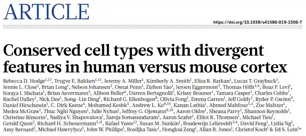 [1] Hodge R D, Bakken T E, Miller J A, et al. Conserved cell types with divergent features in human versus mouse cortex.Nature, 2019, 10.1038/s41586-019-1506-7.
