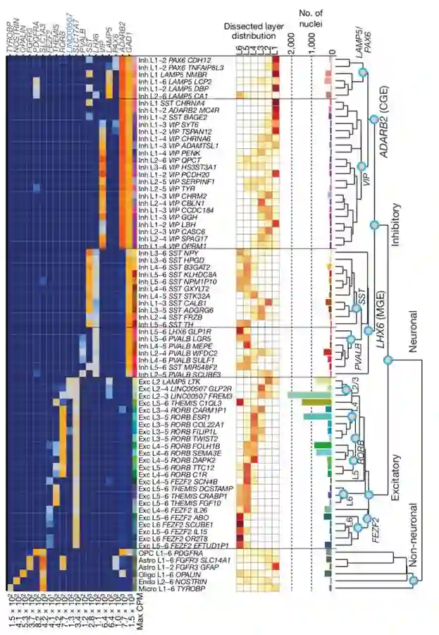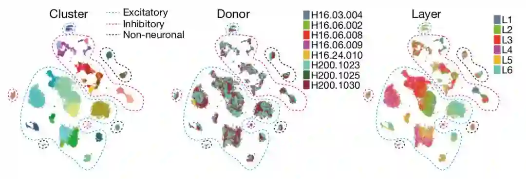 研究者将所测序的15928个细胞分为了75个细胞类型,其中24个类型属于兴奋性神经元,45个类型属于抑制性神经元,其余6个类型属于非神经元细胞。
