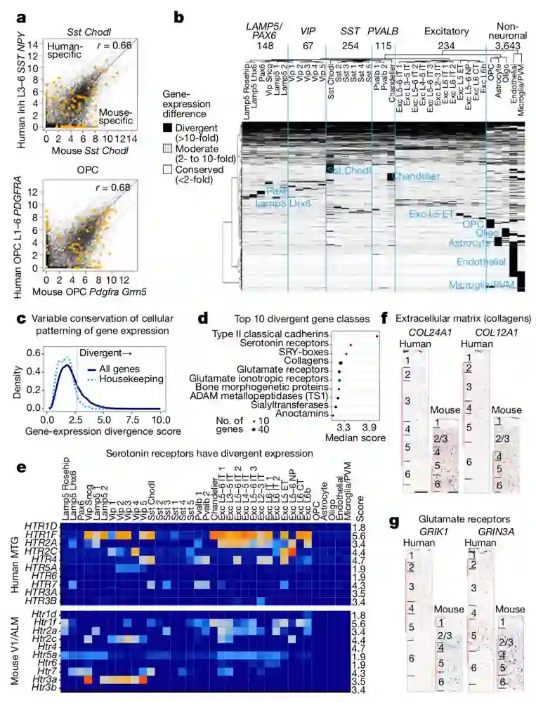 人类与小鼠的大脑皮层细胞基因表达水平存在很大差异,图片来自 Nature