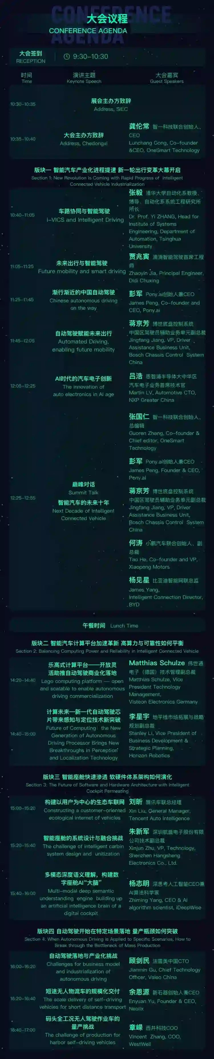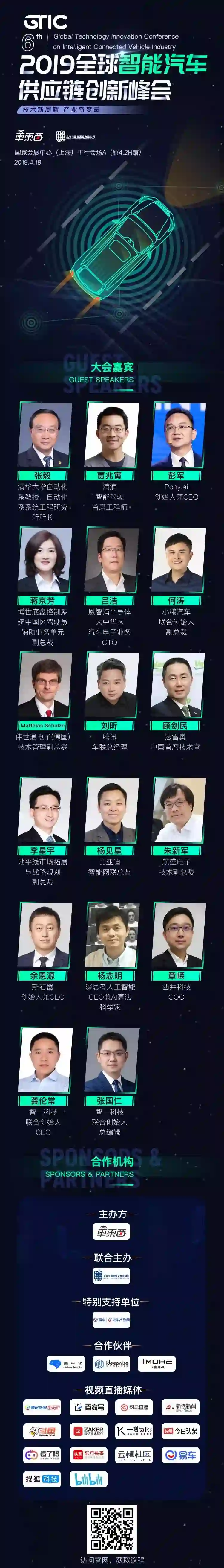 清华大学自动化系教授、博导、自动化系系统工程研究所所长张毅,滴滴智能驾驶首席工程师贾兆寅,Pony.ai创始人兼CEO彭军,博世底盘控制系统中国区驾驶员辅助业务单元副总裁蒋京芳,恩智浦半导体大中华区汽车电子业务首席技术官吕浩,小鹏汽车联合创始人、副总裁何涛,伟世通电子(德国)技术管理副总裁Matthias Schulze,腾讯车联总经理刘昕,法雷奥中国首席技术官顾剑民,地平线市场拓展与战略规划副总裁李星宇,比亚迪智能网联总监杨见星,深圳航盛电子股份有限公司技术副总裁朱新军,新石器创始人兼CEO余恩源,深思考人工智能CEO兼AI算法科学家杨志明,西井科技COO章嵘。