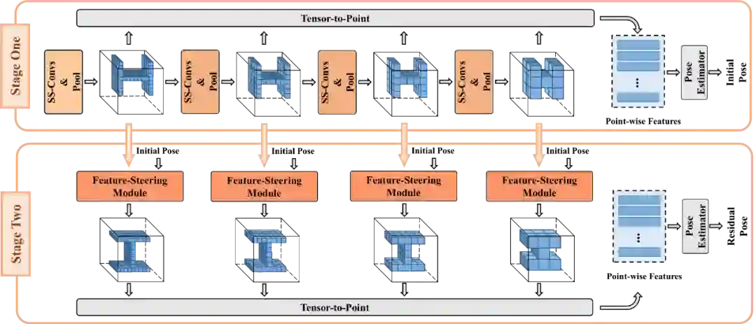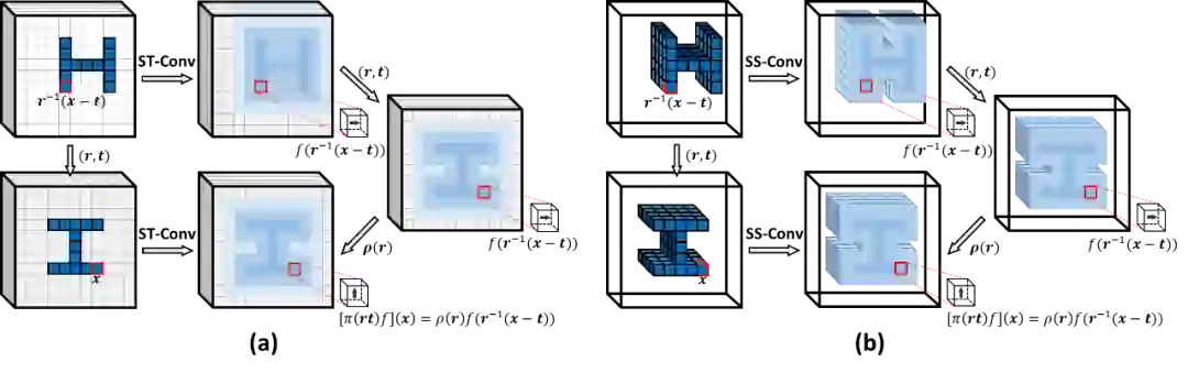 近年来,SE(3) 等变网络在 3D 语义分析任务中发挥着重要的作用,尤以 3D 姿态可控卷积神经网络为代表。3D 姿态可控卷积神经网络利用姿态可控卷积(ST-Conv)逐层学习姿态等变的特征,从而保留 3D 输入的姿态信息。直观地说,对于一个 ST-Conv,关于 3D 输入的任意 SE(3) 变换(r,t),都将诱导输出特征的同步姿态变换,其中r ∈SO(3)表示旋转,表示平移。图 1(a) 进一步给出了解释,给定输入的一个 SE(3) 变换,特征向量所在位置均关于(r,t)进行刚性变换,而特征向量 ρ(r)本身也关于进行旋转(ρ(r)是旋转r的一个表征)。SE(3) 等变的特性激活了特征空间的姿态可控性,例如,SE(3) 变换可通过对特征空间进行操控来直接实现,而无需变换输入。为了生成姿态可控特征,ST-Conv 将特征域限定在 3D 体素数据的规则网格上,使其能通过 3D 卷积方便地实现。对 3D 卷积的兼容简化了 ST-Conv 的实现,但也牺牲了对不规则且稀疏的 3D 数据(例如,点云)的高效处理,导致 ST-Conv 未能在更多 3D 语义分析领域中被广泛使用。