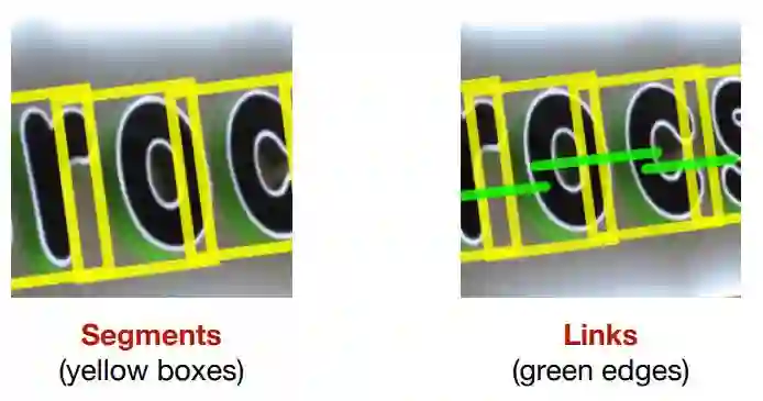 什么是segment?segment从中文上理解为文本行的一部分,这一部分可以是一个字符或文本行的任意一部分。如下图示,黄色框表示一个segment,一个完整的文本行中包含多个segment,每个sgment之间通过link(图中的绿色线)连接组合起来。那么Segment做文本检测的思路其实跟CTPN的思路很像,先检测文本行的一部分,再把他们连接起来构成一个完整文本行。