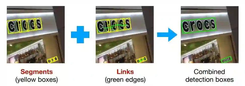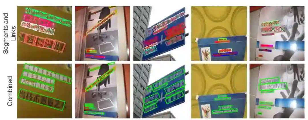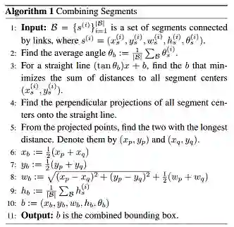 当所有segments都被检测出来后,我们就可以通过融合规则(combining segments),将各个feature map的segment的box信息和link信息进行融合,得到最终的文本行。
