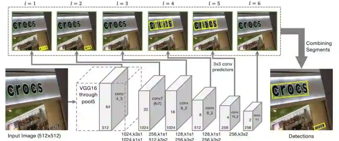 CVPR2017的一篇spotlight论文《Detecting Oriented Text in Natural Images by Linking Segments》介绍以一种可以检测任意角度文本的检测算法,我们一般称这个算法为SegLink,这篇论文既融入CTPN小尺度候选框的思路又加入了SSD算法的思路,达到了当时自然场景下文本检测state-of-art的效果。