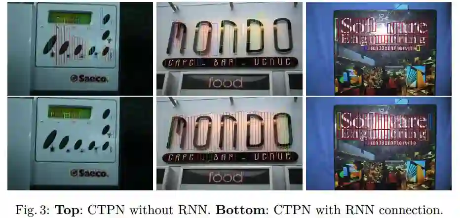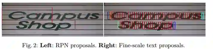如图所示,左边的图是直接使用Faster RCNN中的RPN来进行候选框提取,可以看出,这种候选框太粗糙了,效果并不好。而右图是利用许多小候选框来合并成一个大文本预测框,可以看出这个算法的效果非常不错。