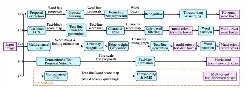 通过下图我们知道,一个文本检测有多个阶段,就以region proposals系的检测算法为例,他们通常包含候选框提取、候选框过滤、bouding box回归、候选框合并等阶段,EAST的作者认为,一个文本检测算法被拆分成多个阶段其实并没有太多好处,实现真正端到端的文本检测网络才是正确之举。所以EAST的pipeline相当优雅,只分为FCN生成文本行参数阶段和局部感知NMS阶段,网络的简洁是的检测的准确性和速度都有了进一步的提高。
