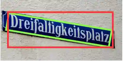 但是对于文本检测任务可不一样,文本的特点就是高宽比特别大或小,而且文本通常存在一定的旋转角度,如果我们对于带角度的文本仍然使用目标检测那个思路回归四个参数(x,y,w,h)来指定一个目标的位置的话(如下图红色框),那显然误差太大了,这个检测效果并不是我们所能接受的。作为对比,下图的绿色框的检测效果才是我们的终极目标。那么怎么基于原来经典的目标检测算法做相应的优化以适应这种检测效果的要求呢?