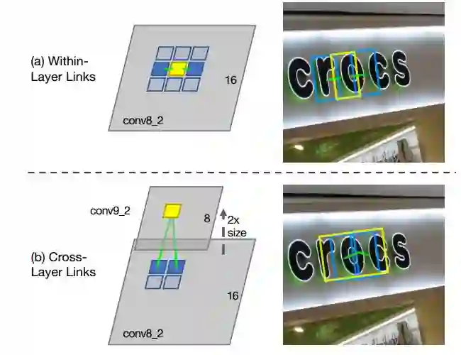 cross-layer link:在不同的feature layer上有可能会检测到同一文本的segments,造成冗余,cross-layer link的提出就是为了解决这个问题。cross-layer link连接了两个相邻feature layer上的segments,如图(b)所示。需要注意的是,由于下采样使后一层为前一层scale的1/2,定义一个segment的cross-layer邻居为前一层4邻域更小的segment,即前一层是后一层的邻居,但后一层不是前一层的邻居,所以conv4_3的feature layer没有cross-layer邻居。图中所示的黄框为当前层的segment,蓝框为上一层更小更细的segment,绿色的线代表cross-layer link有连接,属于同一文本,在后续的combine算法中会将他们融合,即去除了冗余。