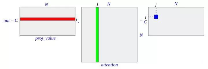 然后,再把 proj_value (C × N)矩阵同 attention 矩阵的转置(N × N)相乘,得到 out (C × N)。之所以转置,是因为 attention 中每行的和为 1,其意义是权重,需要转置后变为每列的和为 1,施加于 proj_value 的行上,作为该行的加权平均。 proj_value 第 i 行代表第 i 个通道所有的像素值, attention 第 j 列,代表所有像素施加到第 j 个像素的影响。