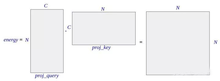 若 batch size=1,就是普通的矩阵乘法。已知 proj_query 维度是 N × C, proj_key 的维度是 C × N,因此 energy 的维度是 N × N: