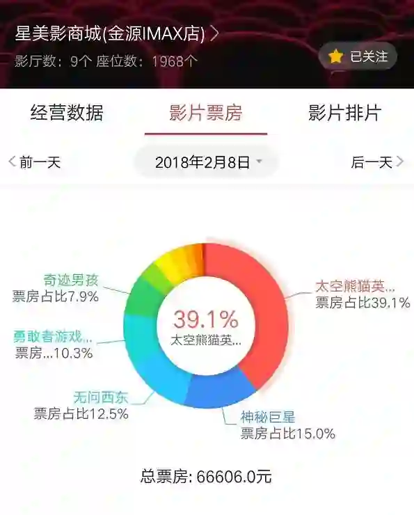 “星美因为欠院线分账款,很多新电影都被停了秘钥。解决方案是买断大量老电影,出假票房。不止是票房差的三四线城市造假,连最好的北京金源店都造假。”杨枭给小娱看了张截图,2018年2月8号,星美北京金源IMAX店,当日票房66606元,其中2016年的片子《太空熊猫英雄归来》贡献了近40%的业绩,力压《神秘巨星》、《勇敢者游戏》等新片。