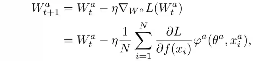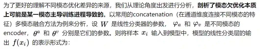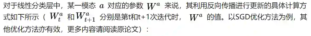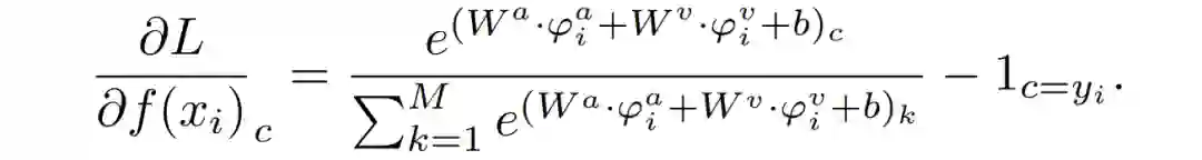 进一步地,我们可以观察到对于 Wa 和 θa 来说,它们在利用反向传播算法更新时,其中相关联的项只有损失函数 L 对于 f(xi) 的偏导,展开该项,我们可以发现当某个模态在线性分类层中对应的通道的输出值较高时,该模态对偏导的贡献较大。也就是说,该模态对模型的梯度反传会起到主导性的作用,随着该模态的收敛,损失函数也会逐渐降低,其他模态也会渐渐失去可优化的空间。