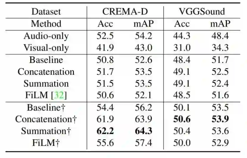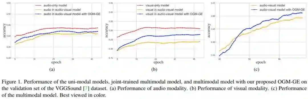 多模态学习的重点是对不同模态的信息进行有效的整合。通常情况下,更多的可利用模态对模型性能的提高是非常有益的。但在实际的训练过程中我们发现,即使多模态模型的性能优于单模态模型,这些不同模态的信息也可能没有得到充分利用(如图1所示,在多模态模型中特定模态编码器表征能力反而不如单模态模型,这说明现有的视听判别模型可能仍然存在欠优化的单模态特征表示)。