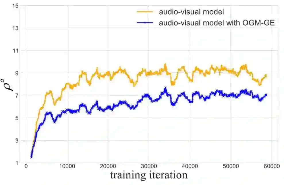 图4展示了OGM-GE调控过程,使用了OGM-GE训练的模型(蓝线),模态间的不平衡比例要显著小于直接训练的模型(黄线)。但由于不同模态间的信息量等存在天然差异等因素,该比例可能无法逼近1,只能在合理范围内减小。