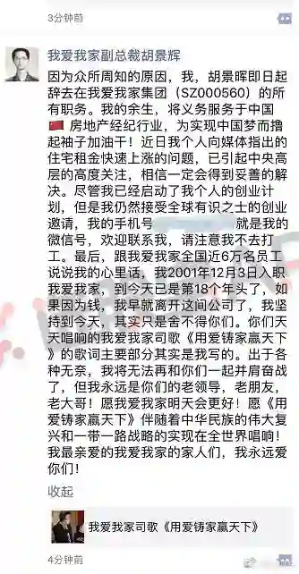 8月18日,我爱我家副总裁胡景晖发朋友圈表示,即日起辞去在我爱我家集团的所有职务。其近日在朋友圈讨论住宅租金快速上涨的问题。链家董事长左晖针对我爱我家副总裁胡景晖辞职一事作出澄清声明,称其对我爱我家集团董事长兼CEO谢勇表达的是“同意大家要一起为行业发展努力,对我爱我家内部事情没有任何观点”。(华尔街见闻)