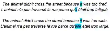 为了说明这一点,我们选择了一个对机器翻译系统来说十分具有挑战的任务,即指代消解(coreference resolution)。我们首先观察下面的英文句子及其法语译文:
