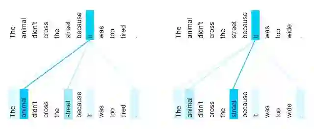 很明显第一个语句中「it」指代的是动物,第二句中的「it」指代的是街道。当我们将该句子翻译为法语或德语时,「it」的翻译取决于它所指代名词的词性,而法语中「动物」和「街道」的词性是不同的。与目前谷歌翻译模型不同,Transformer 能将这些句子正确地翻译为法语。在计算单词「it」最后的表征时,可视化编码器注意的单词将有助于理解网络是如何做出决定的。在其中一个步骤中,Transformer 清楚地识别「it」可能指代的名词是什么,并且不同的注意力反映了系统在不同语境中的选择。